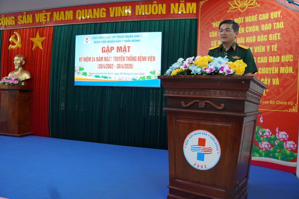 Tiếp nối chương trình, Trung tá, BSCKII Phan Hữu Hùng – Giám đốc Bệnh viện đã phát biểu ôn lại chặng đường 24 năm xây dựng, phấn đấu và trưởng thành. Từ những ngày đầu thành lập còn nhiều khó khăn, đến nay Bệnh viện Quân Dân Y Miền Đông đã trở thành địa chỉ tin cậy, khẳng định vị thế bằng sự tận tâm và chuyên môn vững vàng.