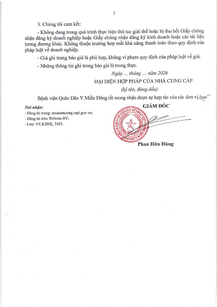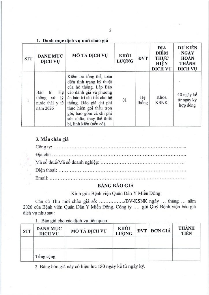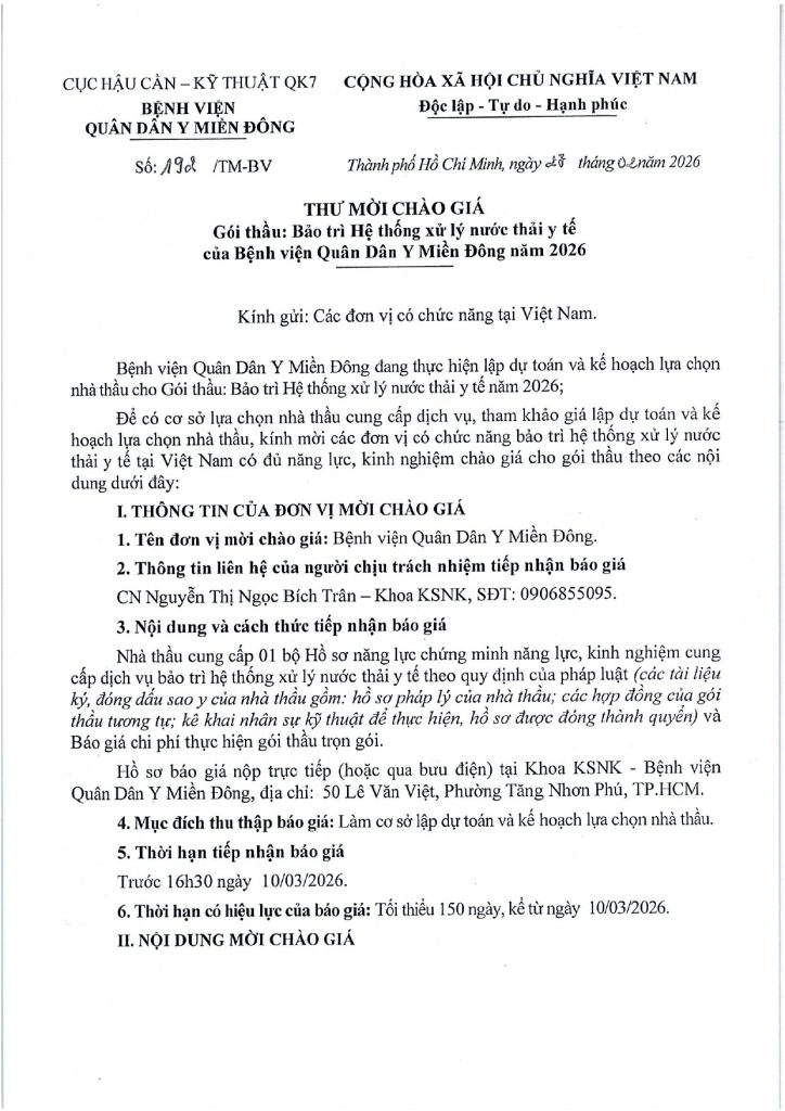 Trang chủ › Thông báo - Văn bản › THƯ MỜI CHÀO GIÁ 49 lượt xem 27/02/2026 Thông báo - Văn bản Thông báo - Văn bản THƯ MỜI CHÀO GIÁ Posted on 27/02/202627/02/2026 by Nguyen Hang 27 Feb Nguyen Hang Bệnh viện Quân Dân Y Miền Đông khai trương năm mới 2026 Bài viết cùng chuyên mục: THÔNG BÁO NGHỈ TẾT NGUYÊN ĐÁN BÍNH NGỌ 2026 THƯ MỜI CHÀO GIÁ THÔNG BÁO NGHỈ TẾT DƯƠNG LỊCH 2026 THƯ MỜI BÁO GIÁ