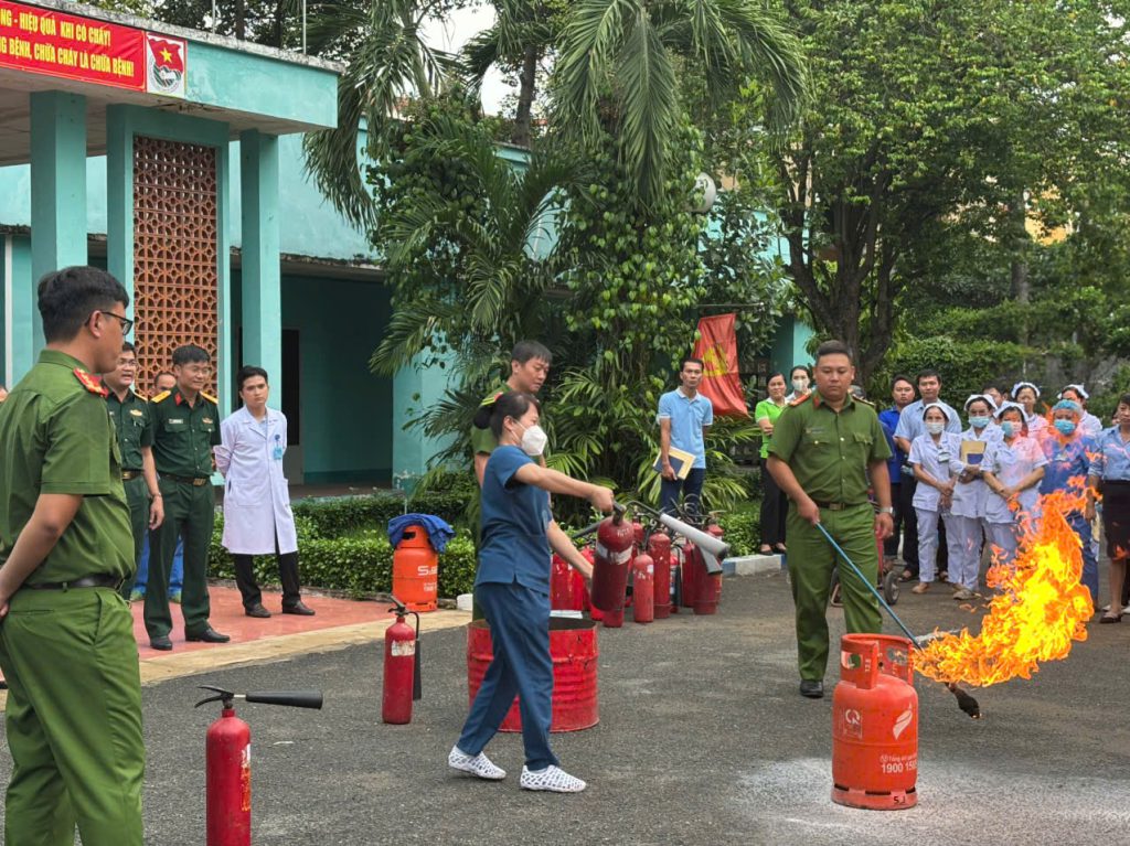Trong phần thực hành, cán bộ, nhân viên Bệnh viện đã được tập huấn các kỹ năng, nghiệp vụ, quy trình xử lý trong công tác phòng cháy, chữa cháy và thực hành sử dụng các bình chữa cháy thông dụng, chữa cháy bằng tay.