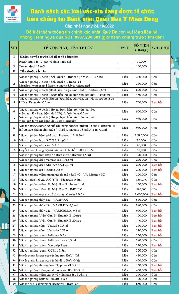 Danh sách các loại vắc-xin đang được tổ chức tiêm chủng tại Bệnh viện Quân Dân Y Miền Đông
