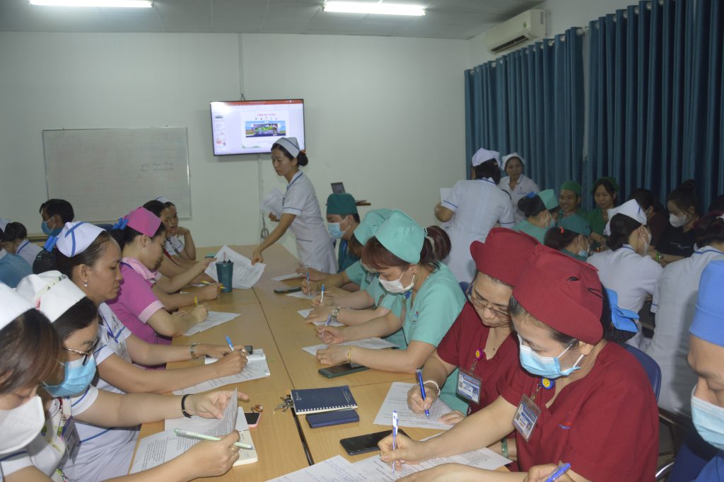 Các học viên làm bài kiểm tra lượng giá đầu vào và đầu ra, đánh giá hiệu quả của chương trình huấn luyện.Trong nội dung chương trình, các học viên được cập nhật kiến thức về định nghĩa tiêm an toàn, hậu quả của tiêm không an toàn, các giải pháp của tiêm an toàn, các bước sơ cứu đối với vùng phơi nhiễm, các tiêu chí đánh giá mũi tiêm an toàn… Tiêm an toàn là kỹ thuật tiêm không gây nguy hại cho người được tiêm, không gây phơi nhiễm cho người tiêm và không để lại chất thải nguy hại cho cộng đồng. Nếu tiêm không an toàn có thể dẫn đến các bệnh lây nhiễm hoặc gây ra những biến chứng nguy hại khác. Vì vậy việc tập huấn, đào tạo tiêm an toàn cần được thực hiện thường xuyên nhằm nâng cao chất lượng chăm sóc và điều trị, phòng tránh tối đa sự cố y khoa tại cơ sở khám chữa bệnh.