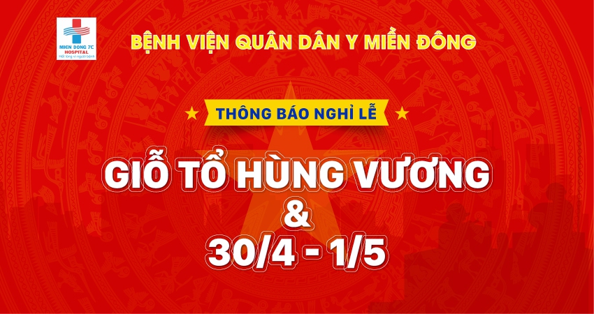 Để đảm bảo thuận tiện cho Quý Bà Con, Cô Bác, Anh Chị sắp xếp thời gian đến khám và điều trị, Bệnh viện Quân Dân Y Miền Đông, Cục Hậu cần, Quân khu 7 trân trọng thông báo lịch nghỉ lễ Giỗ Tổ Hùng Vương (10/3 Âm lịch), Giải phóng miền Nam (30/4) và ngày Quốc tế Lao động (01/5) năm 2024 như sau:
