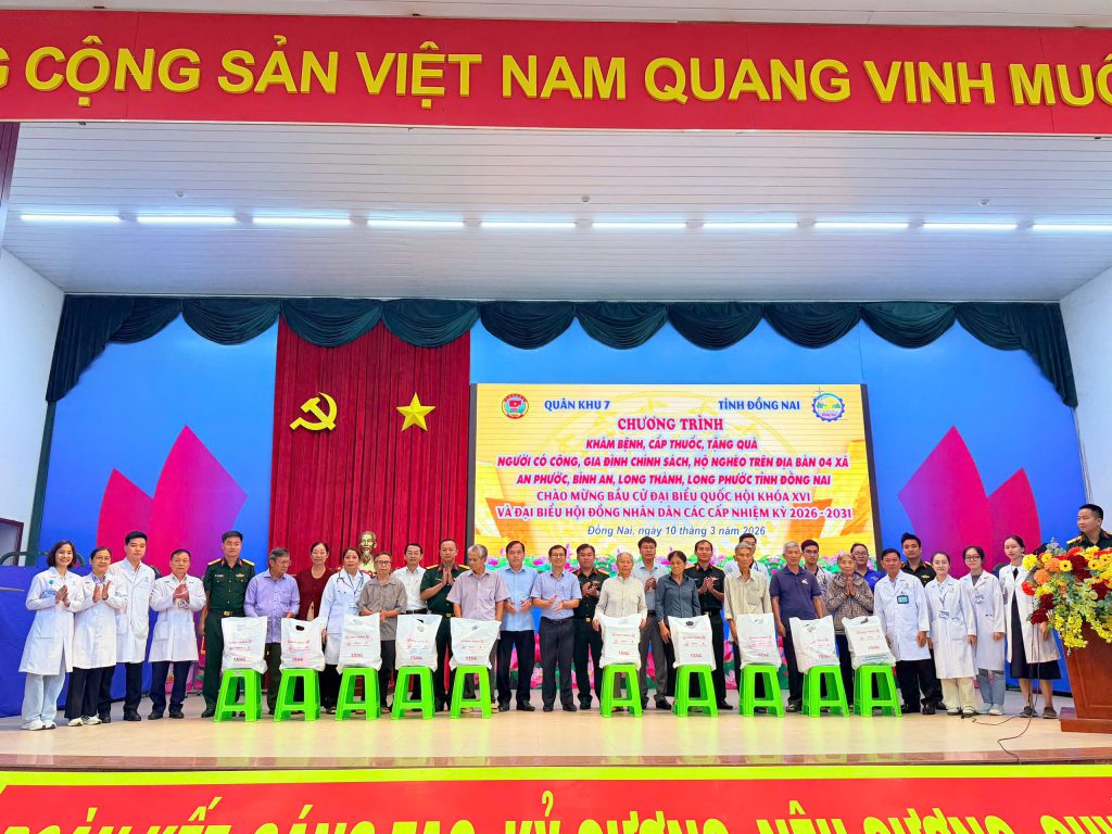 Nhân dịp chào mừng cuộc bầu cử đại biểu Quốc hội khóa XVI và đại biểu Hội đồng nhân dân các cấp nhiệm kỳ 2026 – 2031, ngày 10/3/2026, Bệnh viện Quân Dân Y Miền Đông đã tổ chức chương trình khám bệnh, tư vấn sức khỏe, cấp phát thuốc miễn phí và tặng quà cho 400 bà con là người có công với cách mạng, gia đình chính sách và hộ nghèo trên địa bàn các xã An Phước, Long Phước, An Bình và Long Thành tỉnh Đồng Nai.