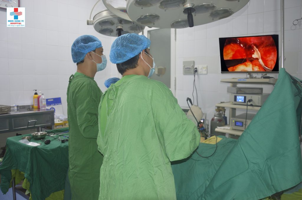 Theo BSCKII. Lê Tấn Tới, Phó Giám đốc Bệnh viện, bác sĩ mổ chính của ca phẫu thuật cho biết: Khi tiến hành mổ nội soi cho bệnh nhân, các phẫu thuật viên thấy khối áp xe vùng dưới gan phải, gỡ khối áp xe thấy dịch mủ đục chảy ra kèm và dị vật là đoạn xương cá nhọn, dài 5cm, một phần đâm vào gan, một phần đâm vào thành dạ dày. Kíp phẫu thuật đã tiến hành lấy mảnh xương cá ra khỏi ổ bụng, hút dịch khối áp xe, lau sạch ổ bụng và đặt dẫn lưu dưới gan.